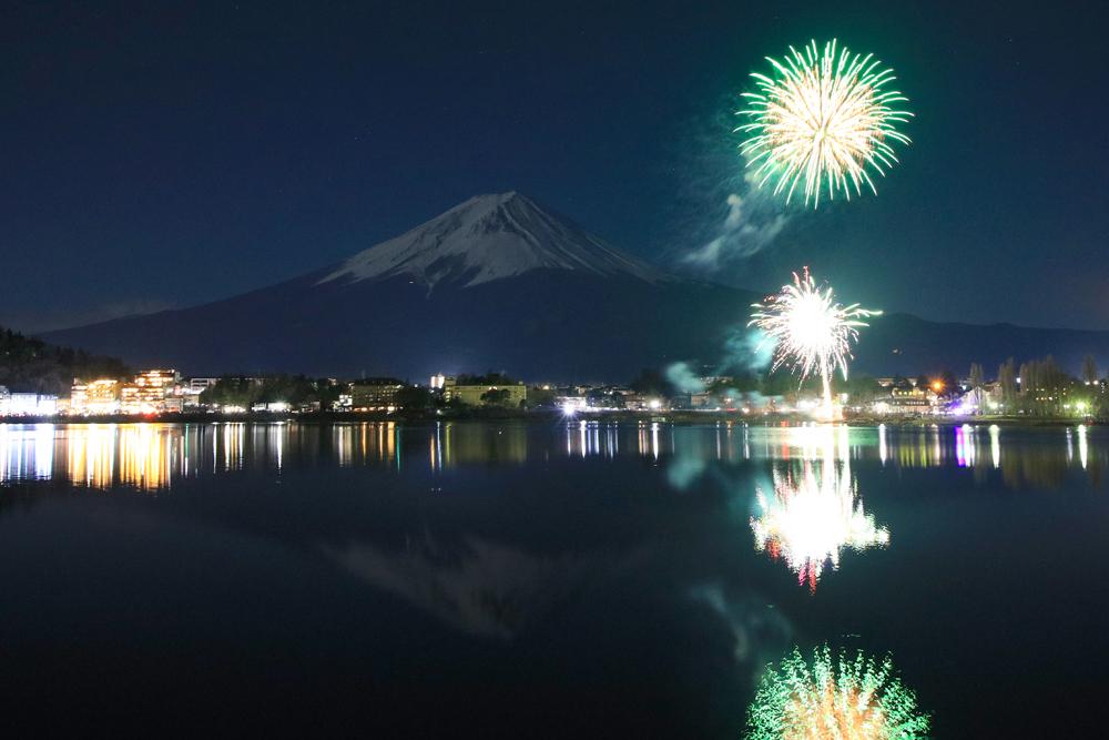 空気が澄んだ冬の夜空に打ちあがる色鮮やかな花火は、夏よりもはっきりと見え、闇夜に佇む富士山のシルエットも魅力的です。