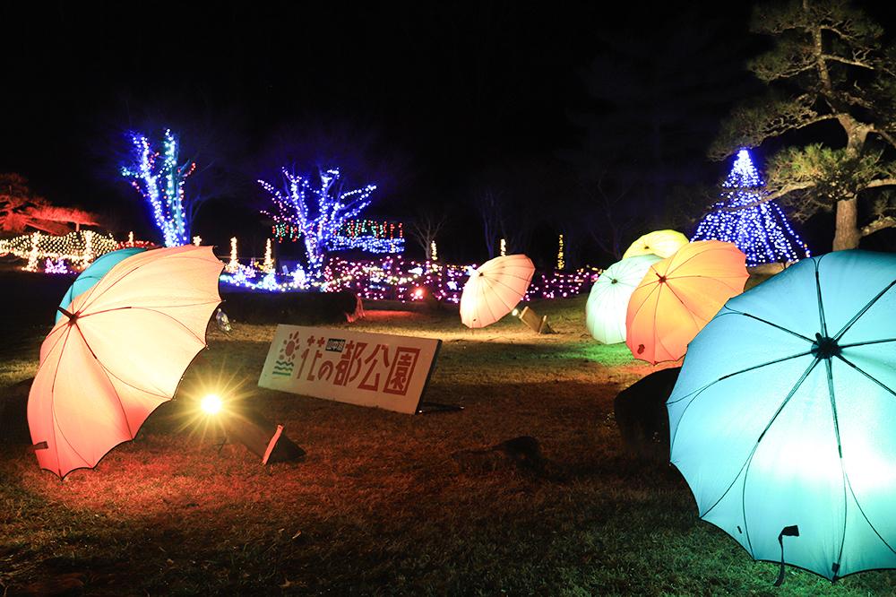 澄んだ夜空の下、様々な工夫が凝らされたきらびやかなイルミネーションが広大な園内を彩り、夕暮れ時には富士山のシルエットとの共演も楽しめます。