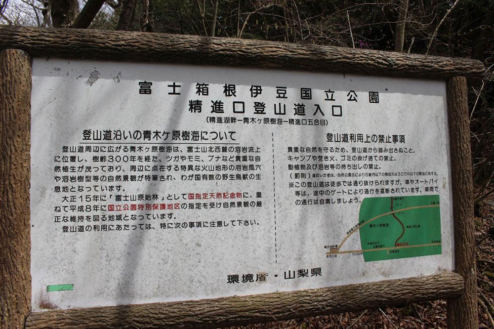 精進口登山道は精進湖を起点として、青木ヶ原樹海を縦断し五合目の小御岳神社を結び18kmと長く、大正12年に開設された比較的新しい登山道とされるが、室町時代に作られたともされる。登山道として整備されたのは大正時代。