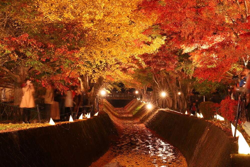 夜になるとライトアップが施され、幻想的な雰囲気の中で富士山と紅葉を楽しめるのが魅力です。さらに、会場周辺には地元グルメや特産品を扱う露店も並び、食と観光の両方を満喫できます。