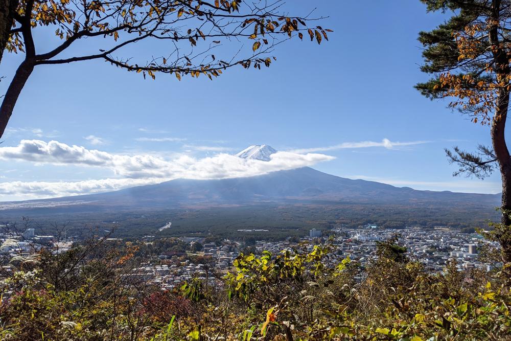 秋には登山道沿いのモミジやカエデが鮮やかに色づき、赤や黄色に染まった木々の間を歩くことができます。山頂や中腹の展望ポイントからは、紅葉に縁取られた河口湖と雪化粧をまとい始めた富士山の姿が一望でき、河口湖らしい絶景を堪能できるのが魅力です。