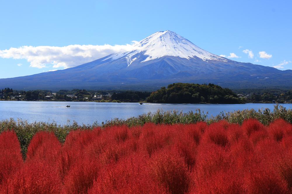 丸く可愛らしい姿のコキアが真っ赤に染まる景観は、モミジやカエデとはまた違った趣があり、富士山を背景にした写真撮影にも人気です。紅葉とコキアが織りなす景色は、河口湖ならではの特別な秋の風景といえるでしょう。