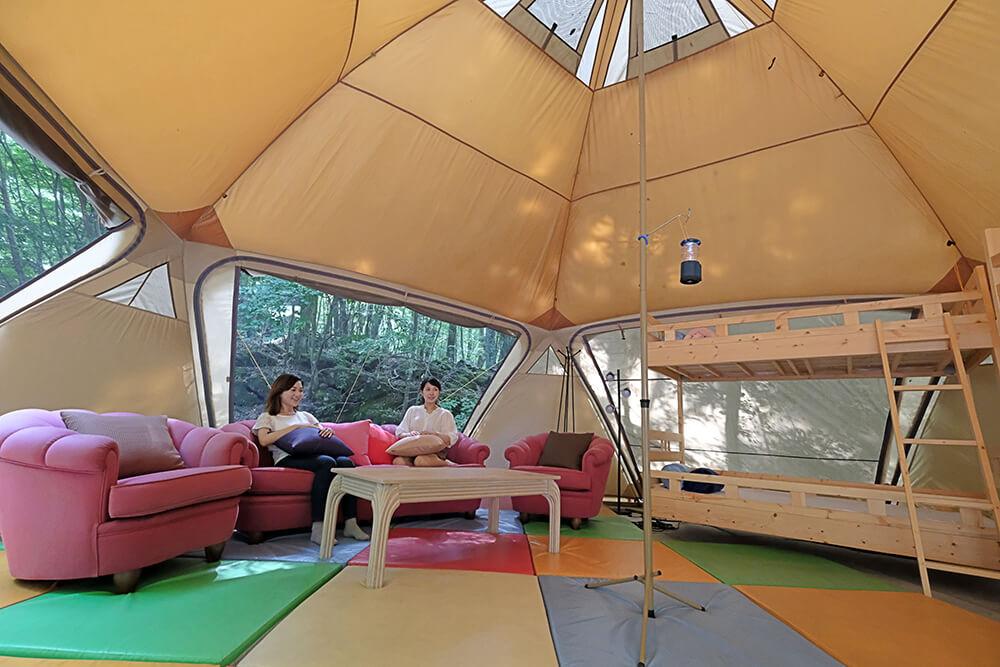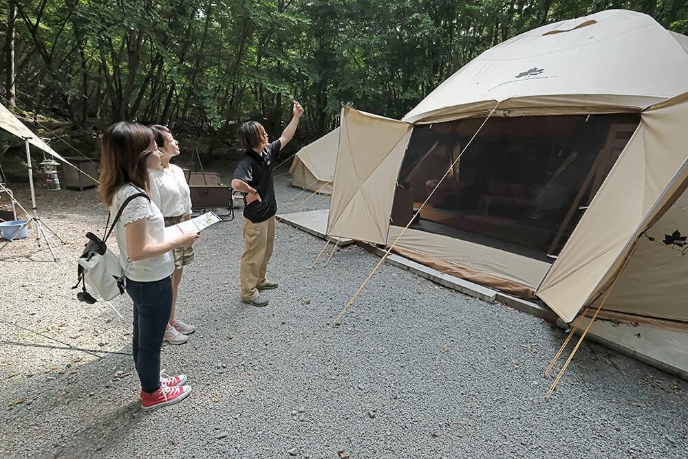 「キャンプあかいけ」には、普通にテントを持ち込むテントサイト、オートキャンプが出来るオートキャンプスペースをはじめ、テントがなくても止まれるバンガロー、そしてこうしたちょっと豪華なテントをあらかじめ設営してある「グランピングサイト」があって、利用する人のキャンプスタイルにあわせてさまざまな利用が出来るようになっています。