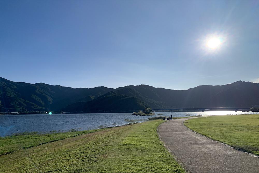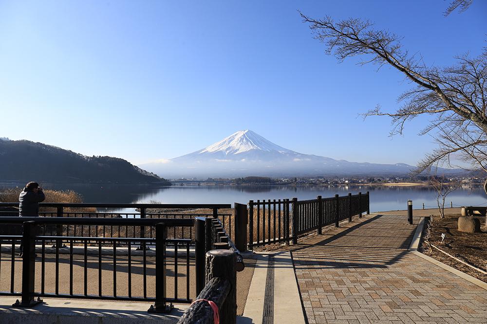北岸のウォーキングトレイルは河口湖美術館付近から大石公園付近までの約3.5㎞で、このエリアからは河口湖越しに裾野まできれいに広がる富士山を眺めることができます。