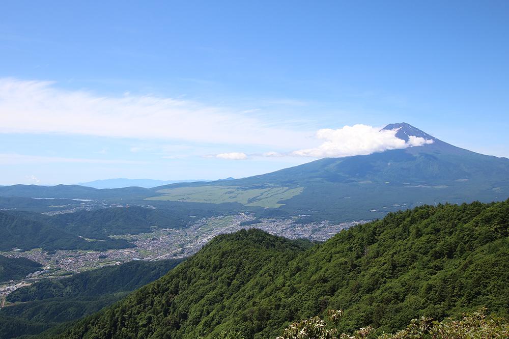 富士山や河口湖一帯はもちろん、南アルプスを望めるほか、条件が良ければ飛騨山脈の穂高岳連峰まで眺めることができる絶好のビュースポットです。夏になると山頂付近には高山植物が咲き誇り、足元の絶景も堪能できます。