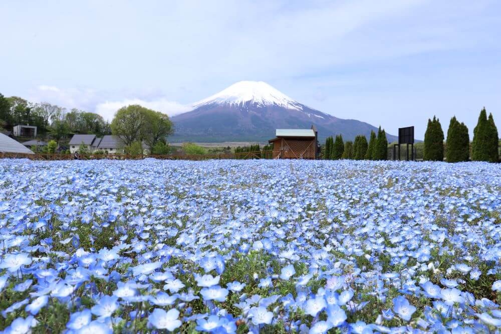 山中湖花の都公園には、無料で花を鑑賞できる花畑・農園エリアと、有料エリアの「清流の里」「フローラルドームふらら」があります。多くの花は無料エリアで見ることができますが、5月が見頃のネモフィラなど清流の里にしかない花もあります。また清流の里には、溶岩樹型の観察体験ゾーンや迫力満点の「明神の滝」など花畑以外にも見どころが多いので、ぜひすべてのエリアを回ってみてください。