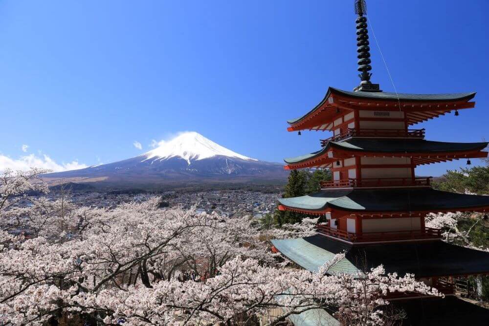 新倉山浅間公園は、富士五湖エリアでも特に有名な桜の名所です。残雪の富士山と桜、五重塔という日本らしい風景が見られるため、外国人からの人気も高い観光スポットです。