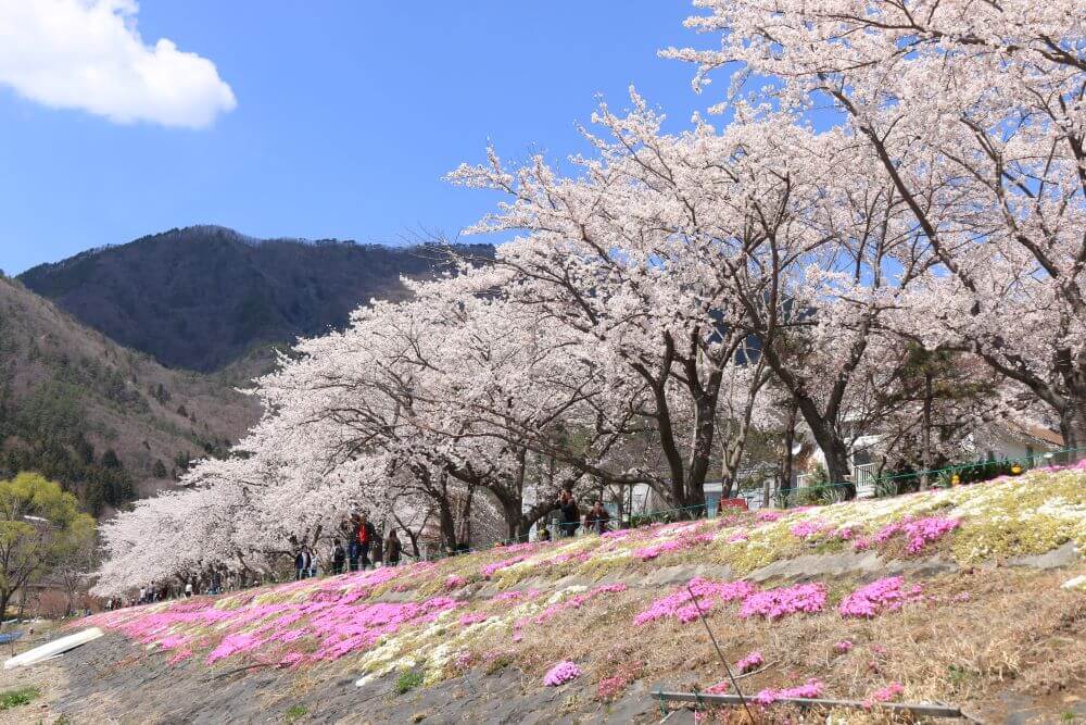 河口湖の北岸、円形ホール周辺のウォーキングトレイル沿いは桜並木が続いており、桜の鑑賞スポットとなっています。桜と河口湖越しの富士山が見られる場所として、観光客やカメラマンに人気がありますよ。桜並木の下には芝桜が咲いている場所もあり、春らしさが感じられます。桜の時期に合わせて「富士・河口湖さくら祭り」が開催され、地元の工芸品が集まるクラフト市などで盛り上がります。