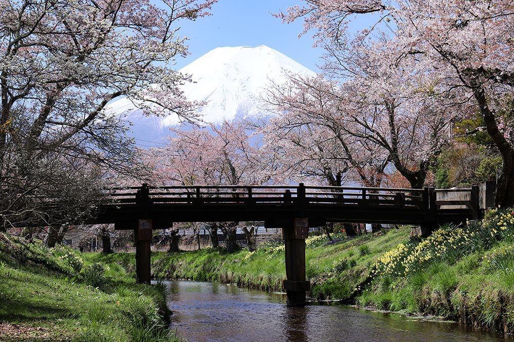 忍野村にあるお宮橋は、忍野八海の近くにある桜の名所です。新名庄川沿いに桜並木が広がり、土手の両側に咲く桜の間から顔を出す富士山の姿を見ることができます。また、忍野八海は世界遺産富士山の構成資産になっている有名な観光名所です。桜と合わせて見に行くことをおすすめします。
