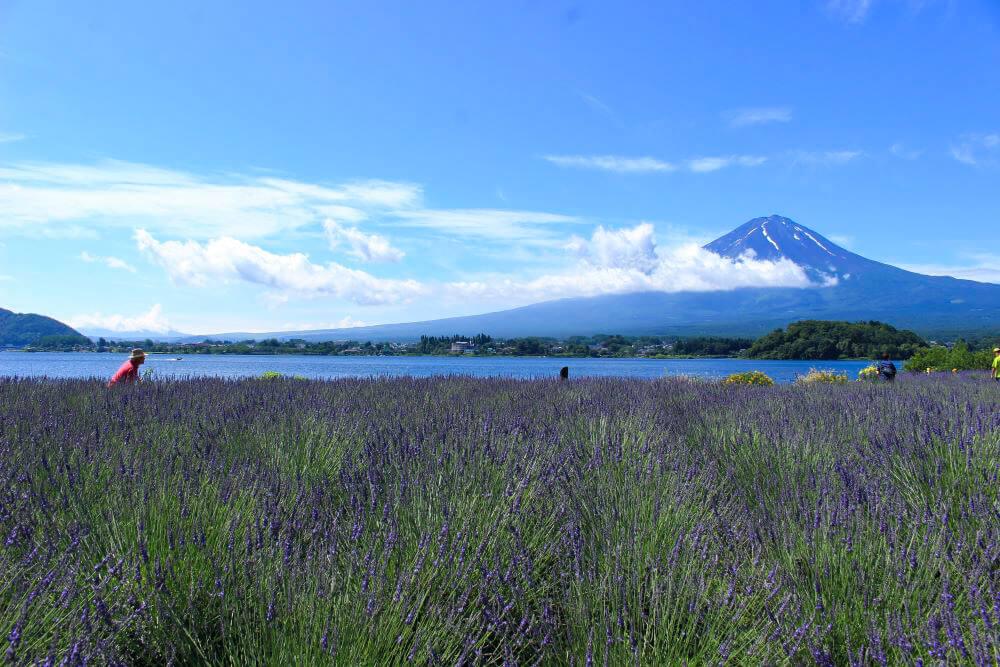 河口湖畔にある大石公園は、富士山の景勝地であるとともに、ラベンダーの名所でもあります。6月下旬から7月中旬にかけて見頃を迎え、紫の絨毯のようなラベンダー畑と河口湖、富士山の絶景を見ることができます。
