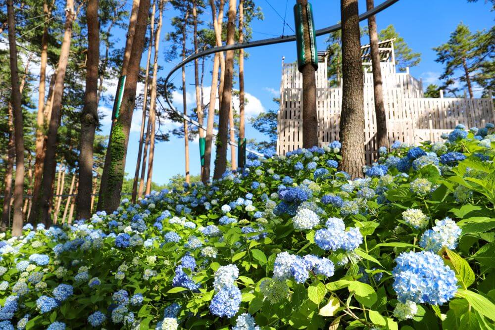 八木崎公園と同じくきれいなアジサイを見られるのが、富士スバルライン料金所手前にあるテーマパーク「富士すばるランド」です。園内には多くのアジサイが植えられており、立体迷路近くの道など園内各所を鮮やかな青に染め上げます。富士すばるランドは標高が高い場所にあるため、都内などの平地に比べてアジサイの咲き始めが遅く、夏休みに入っても花が咲いている年もあります。子供と一緒に家族で見に来てはいかがでしょうか?