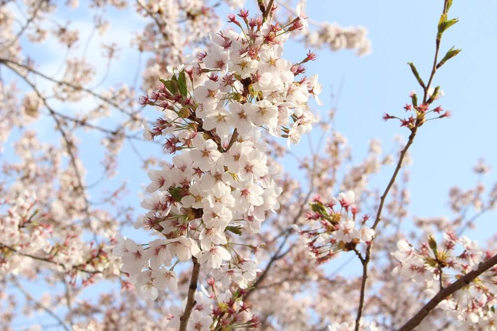 よく見ると若葉が少しだけ出はじめています。花びらも少しだけ散っていますね。桜の花の中心は咲き始め白っぽい色をしていますが、満開を過ぎ、散る間際になると段々と赤くなってきます。桜の花びらが散る瞬間を撮影したい時は、花の中心を注意して撮影するとシャッターチャンスを逃しませんよ。