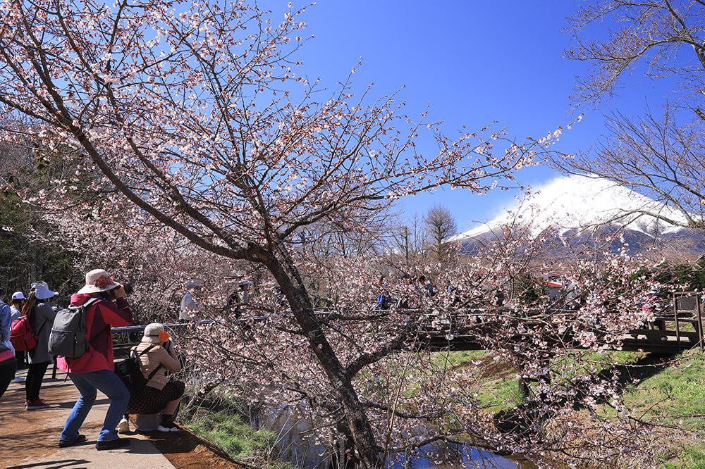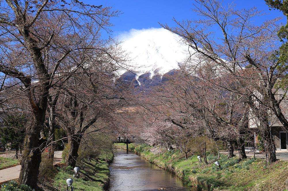 天然記念物でもある「忍野八海」のすぐ近くを流れる「新名庄川」。富士山をバックに桜の木があり、お宮橋から見える風景はとても綺麗です。