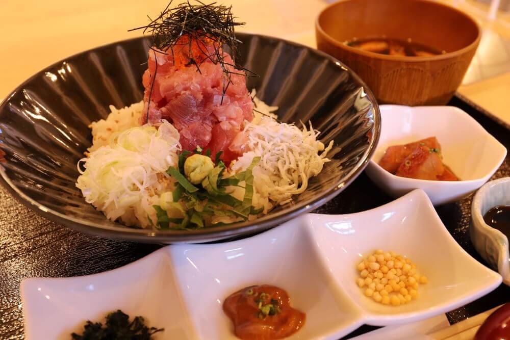 海鮮丼専門店「海鮮 栄正」では、市場の雰囲気が漂う店内で、豊洲直送の新鮮な海の幸が味わえます。マグロ・カンパチ・イカ・シラスなどがのったベースとなる海鮮丼に、ウニやイクラ、ボタンエビなど豊富な種類のトッピングを自由に追加し、自分好みの海鮮丼をいただけます。〆は鯛ダシのお茶づけにすることができ、最後まで満足感たっぷりです。