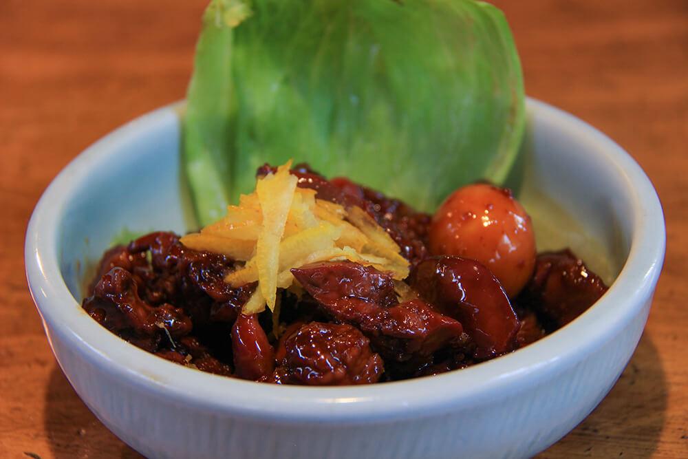 鳥もつ煮は、鳥のレバー・ハツ・砂肝とキンカン(生まれる前の卵)を甘辛く味付けしたもので、ご飯のおかずにもお酒の肴にもなります。ぜひ元祖の味をお楽しみください。