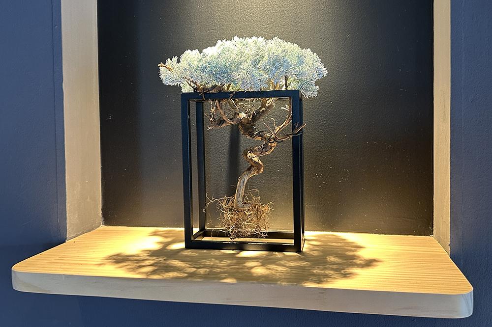 これは、デザイナーが1つ1つ手作りした盆栽のアート作品で、高級感がありながらも和やかなムードを醸し出しています。