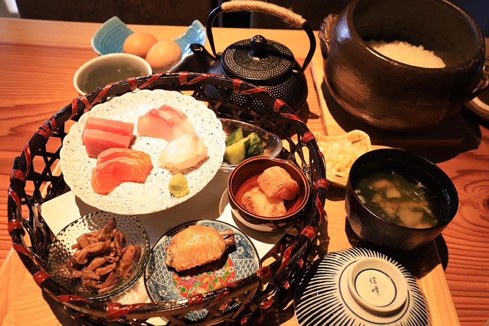 メイン料理は黒毛和牛のステーキやすき焼き、旬のお刺身など贅沢なラインナップから選ぶことができ、付け合わせには土鍋ご飯と忍野村産の生卵、国産岩海苔もおかわり自由で付いてきます。