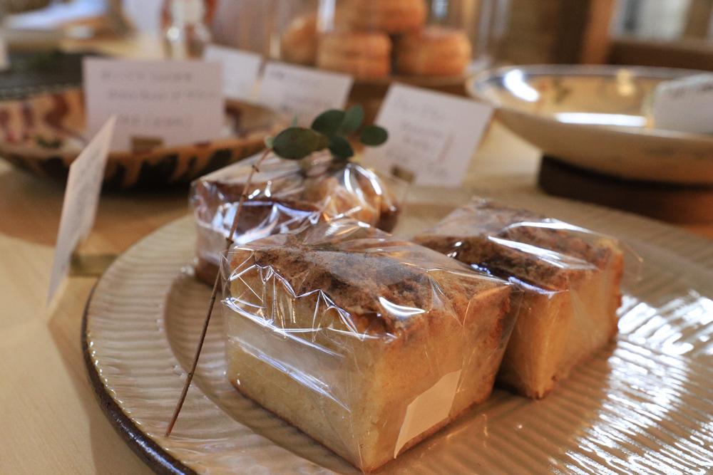 ショーケースには季節の果物や店主こだわりの食材にスパイスやハーブをブレンドした焼き菓子が並びます。