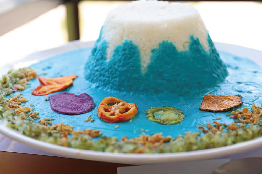 青色のインパクトに一口目をためらう方もいるようですが、もちろん味は保証付き。ホワイトカレーがベースになっていて、何度も試作を繰り返してたどり着いたのがこの色と味なんだとか。そして青い富士山の山肌を下った先には、フライドオニオンの溶岩とピクルスの樹海もあって、リアルな富士山周辺がお皿の中に再現されています。