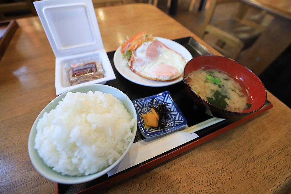 ご飯とお味噌汁に加え、目玉焼きと納豆、サラダがつき、他のメニューに比べて量は控えめながらもリーズナブルで栄養満点です。