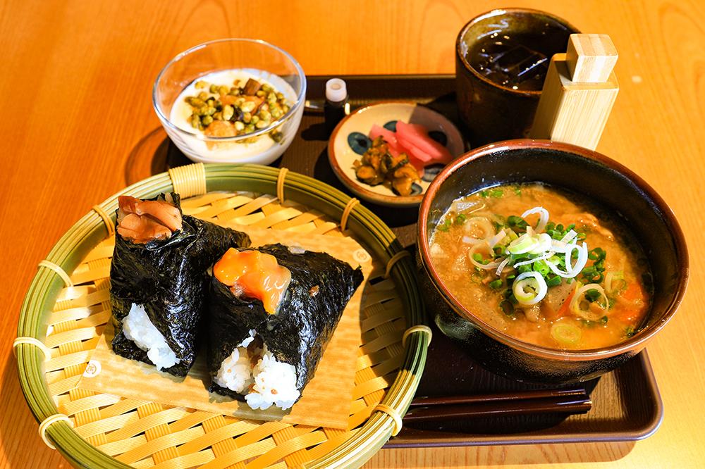 2種類のおにぎりにお味噌汁やドリンク、デザートがついた贅沢なセットで、おにぎり単品での注文も可能です。