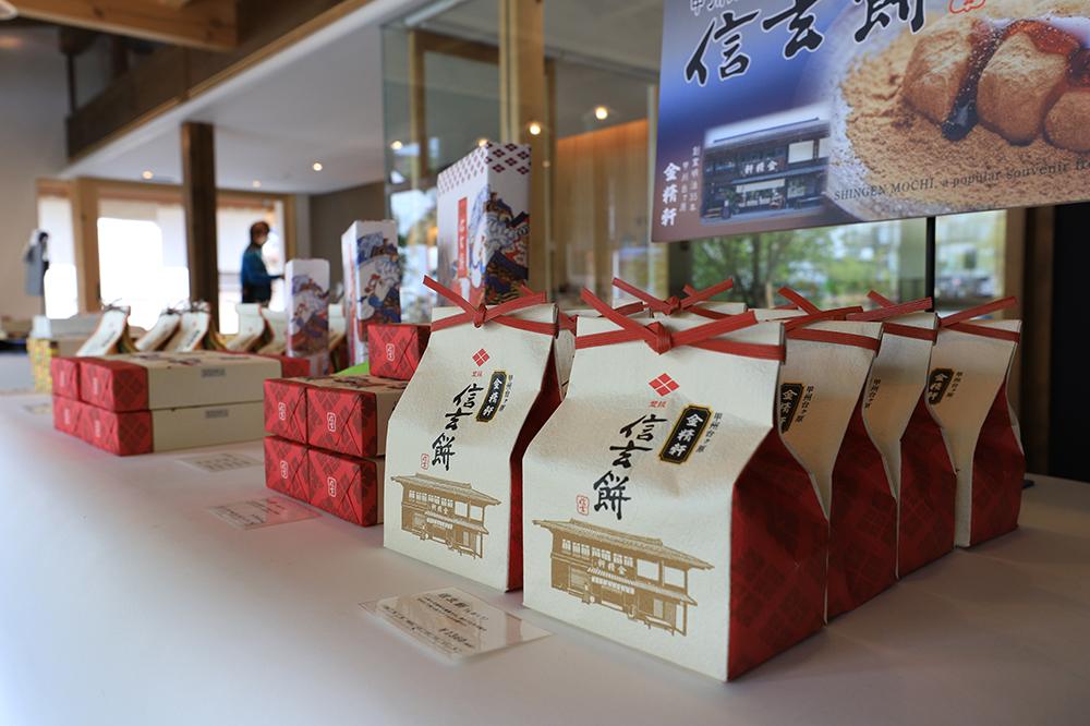 ショップでは山梨の銘菓「信玄餅」の老舗として知られる「金精軒」の和菓子などを購入でき、カフェではお茶やスイーツなど軽食を楽しむことができます。