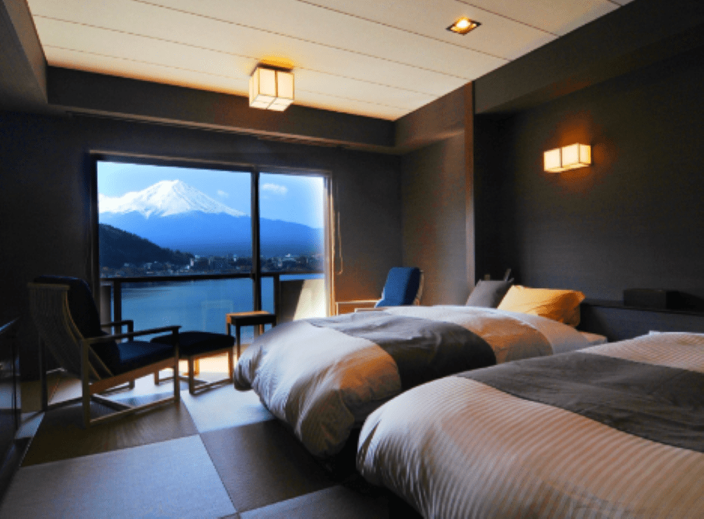 すべてのお部屋から河口湖と富士山を見ることができますが、お部屋によって見え方は少しずつ異なります。