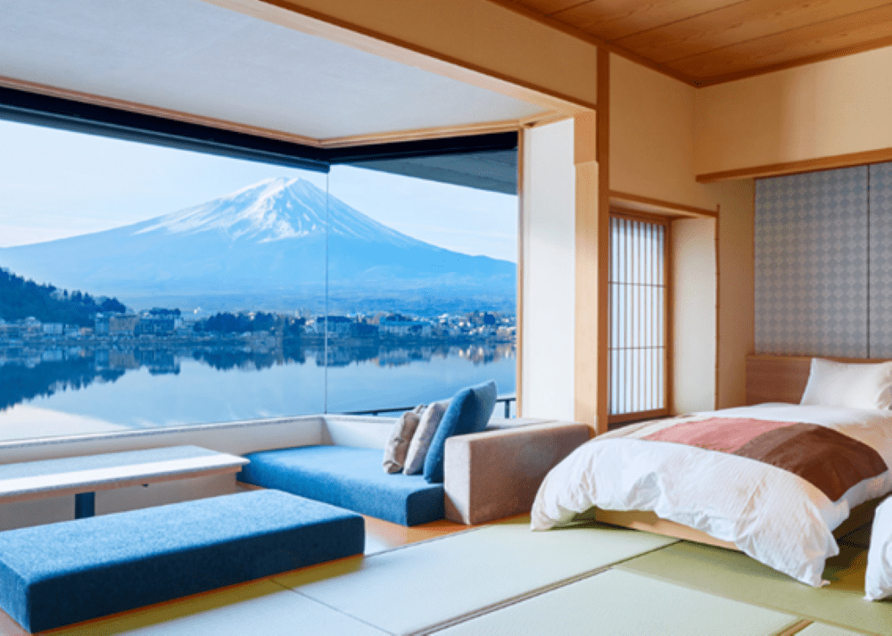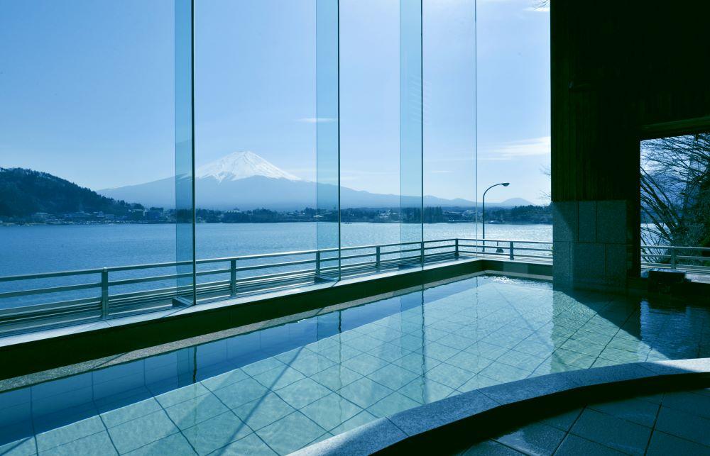 河口湖畔にある「うぶや」は、宿のどこにいても富士山を楽しめる絶景旅館です。