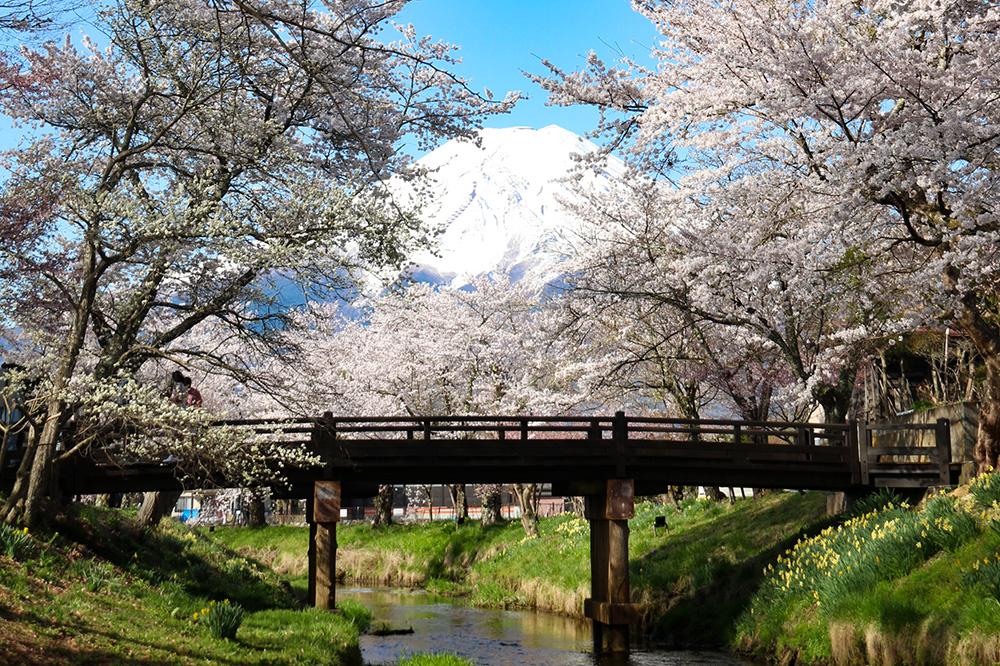 春には川沿いに立ち並ぶ桜と富士山のコラボが楽しめる