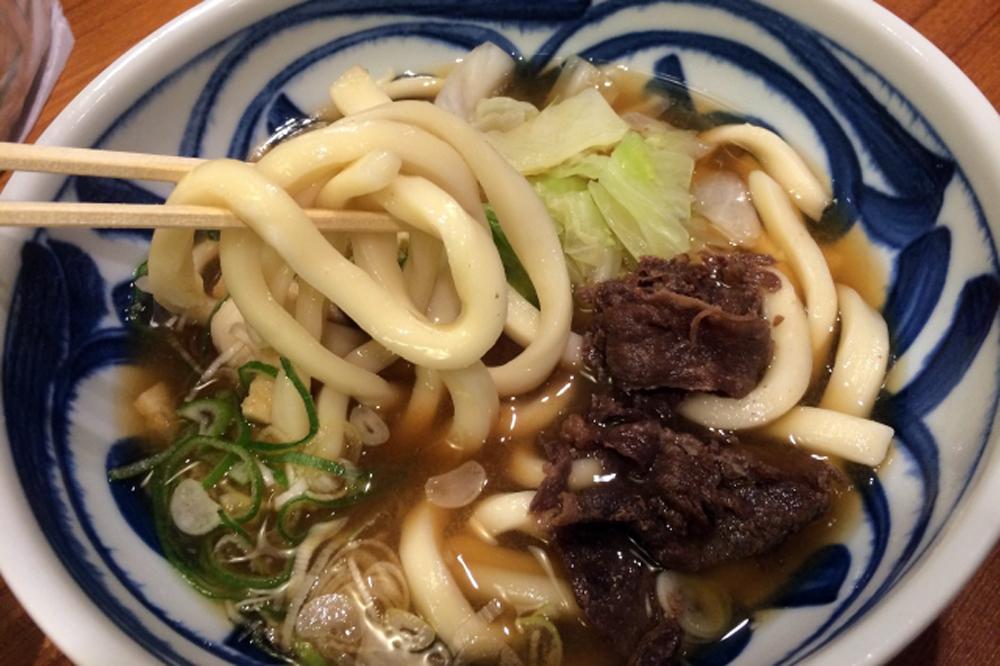 吉田のうどんの最大の特徴は、硬くてコシが強い麺。醤油と味噌をブレンドしたスープと、噛めば噛むほど素材の旨みが広がる麺に虜となります。