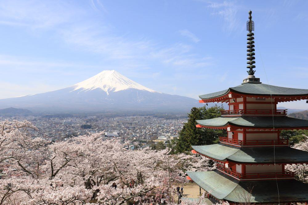 4月から5月は桜の季節で、河口湖畔や新倉山浅間公園をはじめ様々な場所で桜と富士山の絶景が楽しめます。富士吉田の中の茶屋などが有名な群生スポットであるフジザクラは、ソメイヨシノなどほかの品種と比べて開花が遅いため、比較的長い期間お花見を楽しめます。