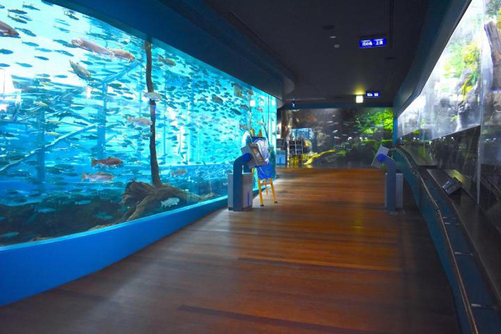 ・ 富士山の湧水を利用した透明な水槽で、魚たちが泳ぐ姿を間近に観察できます。