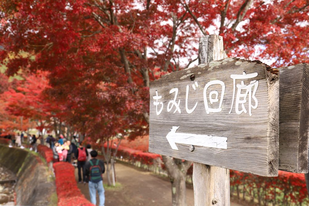もみじ回廊の見頃は11月上旬~下旬にかけてです。上旬にはまだ青い葉が残っていることが多いため、真っ赤になったもみじ回廊を見たいなら中旬以降がねらい目です。下旬になると落葉の絨毯が広がります。