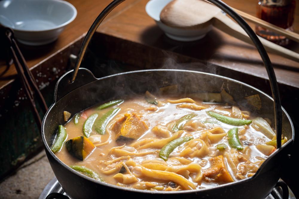 また、山梨名物といえば「ほうとう」。太めの平打ち麺と野菜がたっぷり入った味噌仕立ての鍋料理で、夏でも冷房の効いた店内で食べればほっとできる郷土の味です。