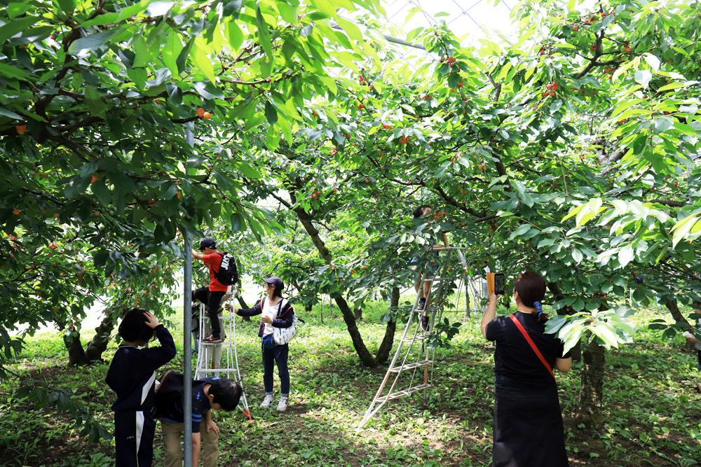 富士五湖エリアも例外ではなく、フルーツ狩りを楽しむことができますが、標高が高く寒涼な気候であることから多くの人が「山梨県」と聞いて想像する桃やぶどうといった果物はあまりつくられていません。河口湖周辺では、さくらんぼやブルーベリー、フルーツトマトなどが多く栽培されていて、時期を変えながら比較的長い期間フルーツ狩りを楽しむことができます。