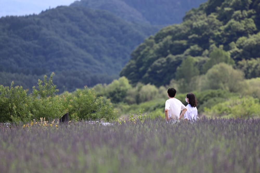 河口湖の湖畔沿いにある「大石公園」は、季節ごとに咲き誇る花々の先に河口湖と富士山を一望できる人気の絶景スポットです。特に6月~7月になると、紫の絨毯のように一面にラベンダーが咲き誇り、多くの観光客で賑わいます。また、公園内の「河口湖自然生活館」にはおしゃれなカフェもあります。カウンター席からは綺麗な花やラベンダーが咲く庭園と富士山を見ることができ、景色を楽しみながら一休みするのに最適です。
