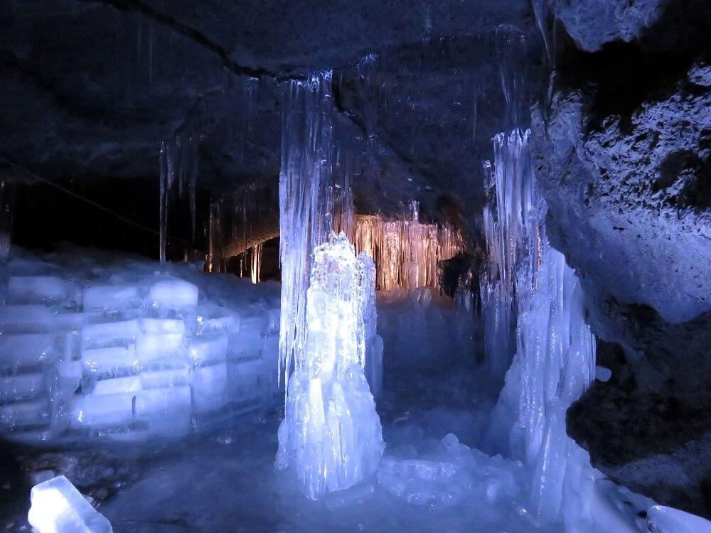 夏のドライブコースは暑さを忘れる涼しいスポットを紹介します。まずは西湖の近く、富士の樹海の中にある「鳴沢氷穴」「富岳風穴」です。天然の冷蔵庫ともいわれ、夏でも内部の平均気温が3℃ほどという溶岩の洞窟で、国の天然記念物にも指定されています。奥に進むと大きな氷柱もありますよ。洞窟内の散策はワクワク気分を味わうことができ、子供から大人まで楽しむことができます。そのあとは、河口湖にあるかき氷の名店「信水堂」や、マイナスイオンたっぷりの「母の白滝」に向かいましょう。