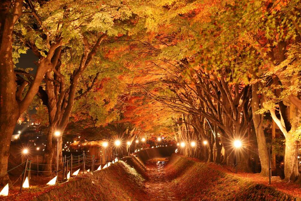 富士山五合目で紅葉を見た後は、河口湖屈指の紅葉の名所「もみじ回廊」にも立ち寄りましょう。河口湖の北岸にあり、河口湖大橋を渡って行くことができます。11月に開催される「河口湖紅葉まつり」の会場にもなっており、期間中は出店で賑わうほか、夜になると紅葉がライトアップされ幻想的な雰囲気に包まれます。昼間の紅葉もきれいですが、夜のライトアップされた紅葉は特におすすめです。