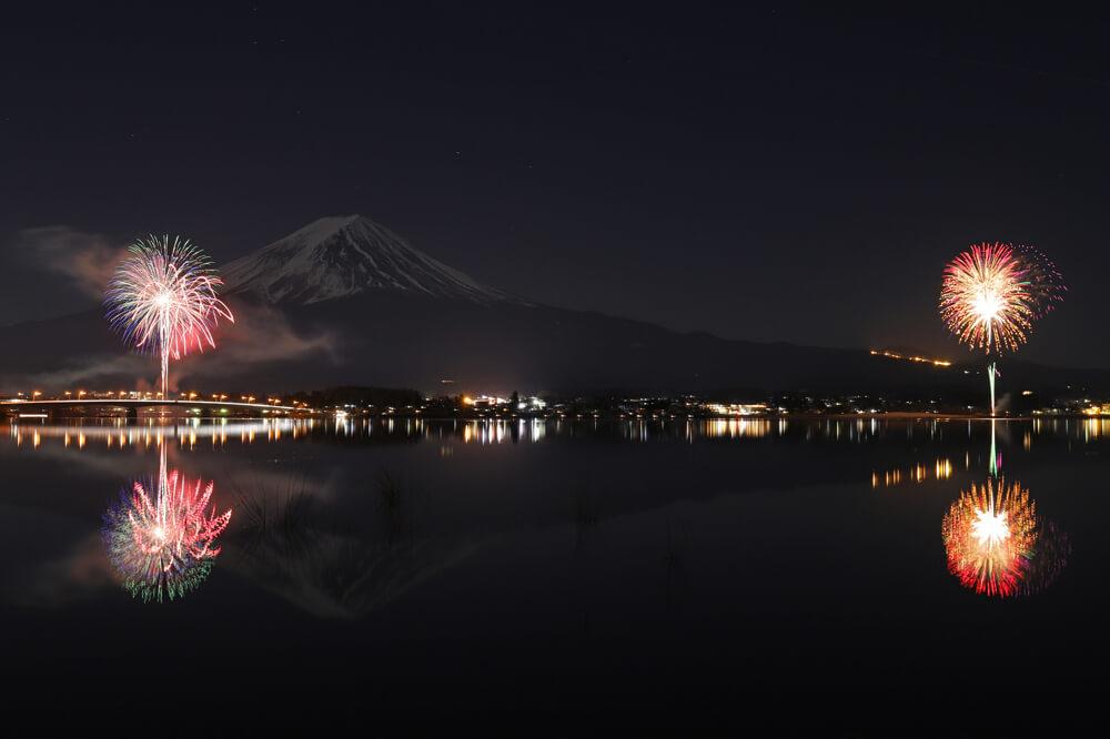 大池公園などの打上会場で見る花火も迫力満点で楽しめますが、富士山をバックに花火を鑑賞できるスポットとして産屋ヶ崎や河口湖北岸のウォーキングトレイルも人気です。