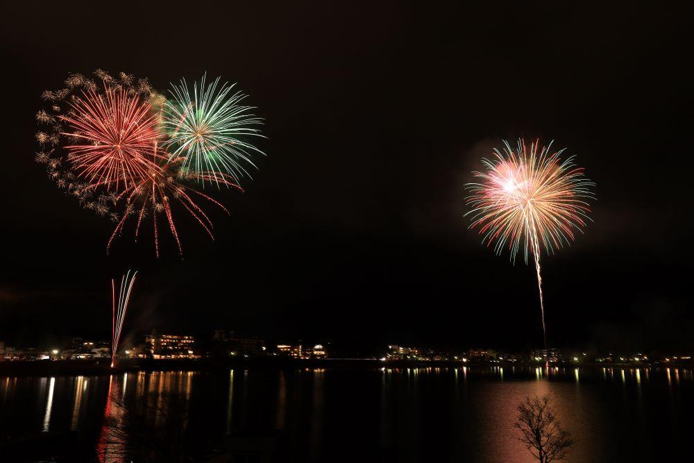河口湖畔の様々な場所で花火が見られますよ。おすすめはメイン会場の大池公園や、産屋ヶ崎、大石公園などです。冬の澄んだ空気に上がる花火を堪能しましょう。
