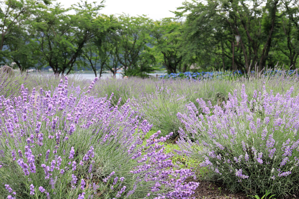 ラベンダーが楽しめるのは、河口湖北岸の人気観光スポット「大石公園」と、南岸エリアの「八木崎公園」です。