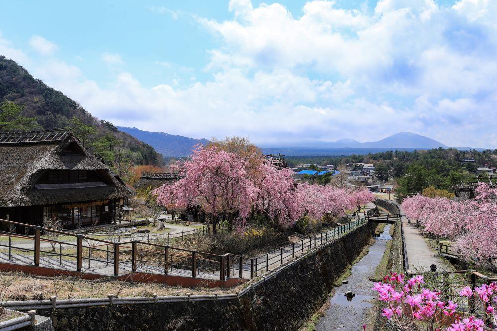 春になるとしだれ桜がきれいに咲き、茅葺き集落とその奥にそびえる富士山と合わせて古き良き日本の春が目の前に広がります。西湖から精進湖に向かう道中にあるため、ぜひドライブコースに組み込んでみてください。