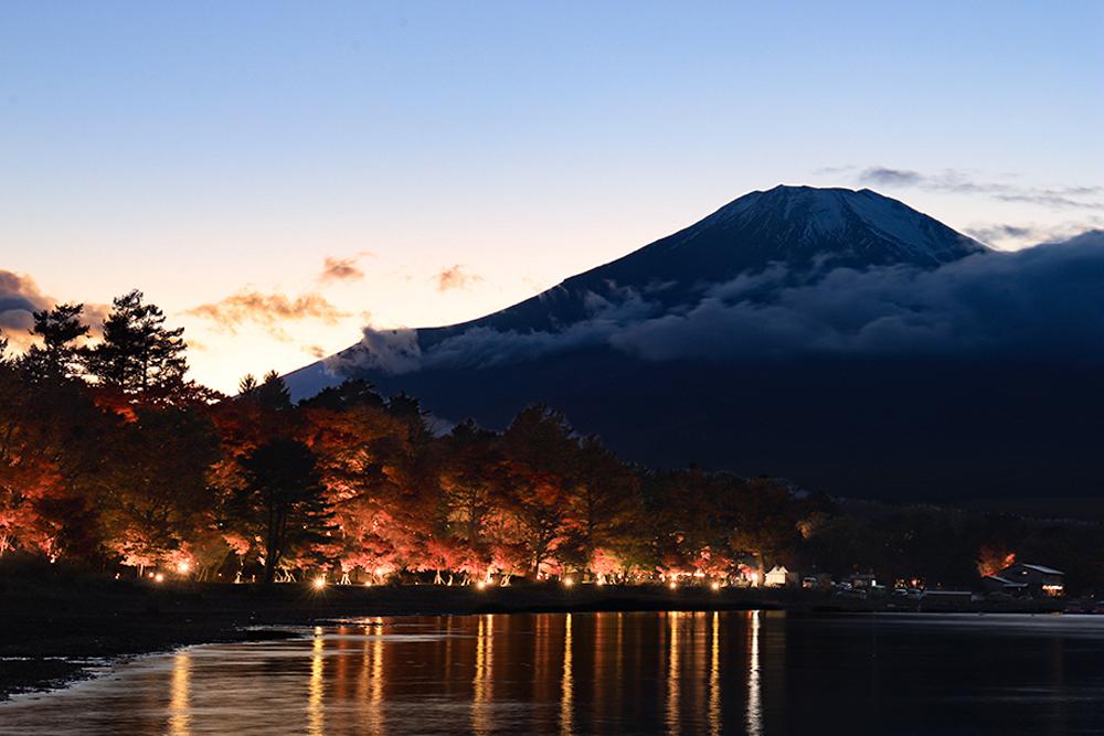 特に夕暮れ時は、夜空にそびえる富士山のシルエットとライトアップされた紅葉を同時に見ることでき、思わずカメラに収めたくなる景色が広がります。