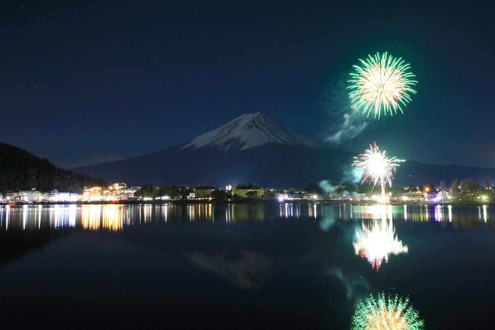 気候条件が良ければ、河口湖の湖面に逆さまの富士山や花火のシルエットが映り込んでくれるかもしれません。