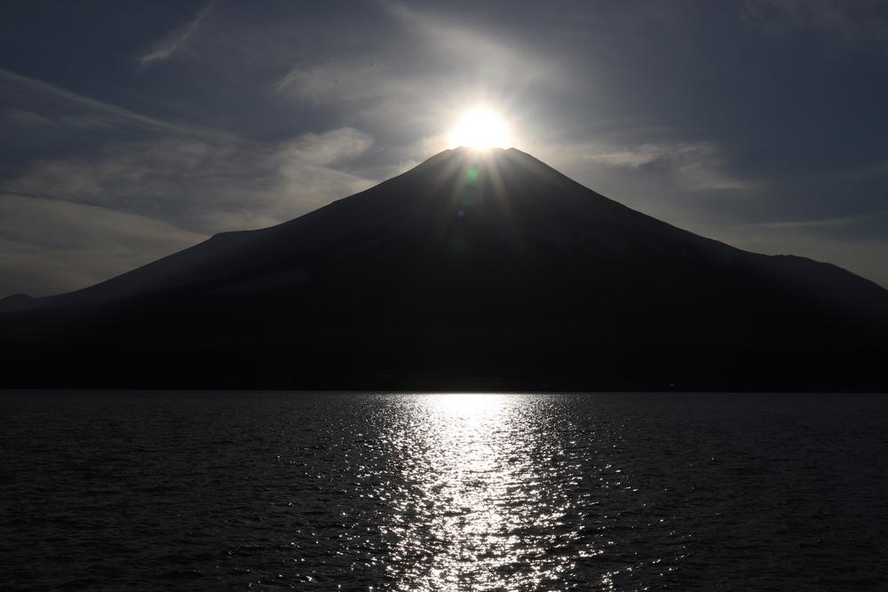 日没時に、富士山頂にぴったりと重なる美しい景色と、湖畔に光が揺らめく光景は自然が創り出す神秘の瞬間といえるでしょう。