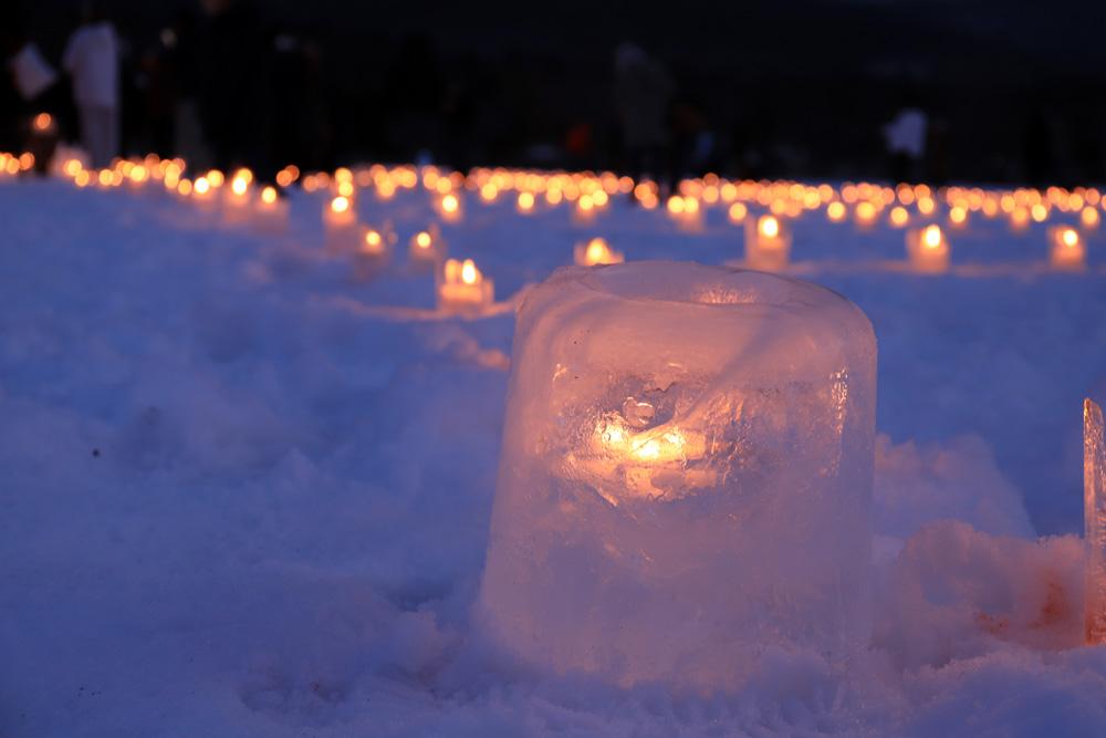 夕暮れ時になると、数百個もの手作りアイスキャンドルが暗闇に灯り、素朴な光が日没後の湖畔の風景を柔らかく彩ります。
