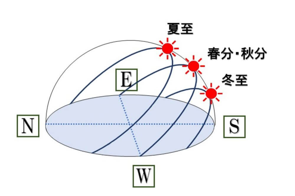 太陽が昇る方角は季節ごとに異なります。春分と秋分には真東から太陽が昇りますが、春分~秋分にかけての夏の期間は北東から、逆に秋分~春分にかけての冬の期間は南東から太陽が昇ります。