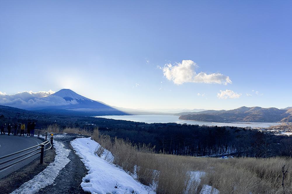 冬のパノラマ台からは冠雪した富士山と白銀の山中湖一帯を眺めることができます。