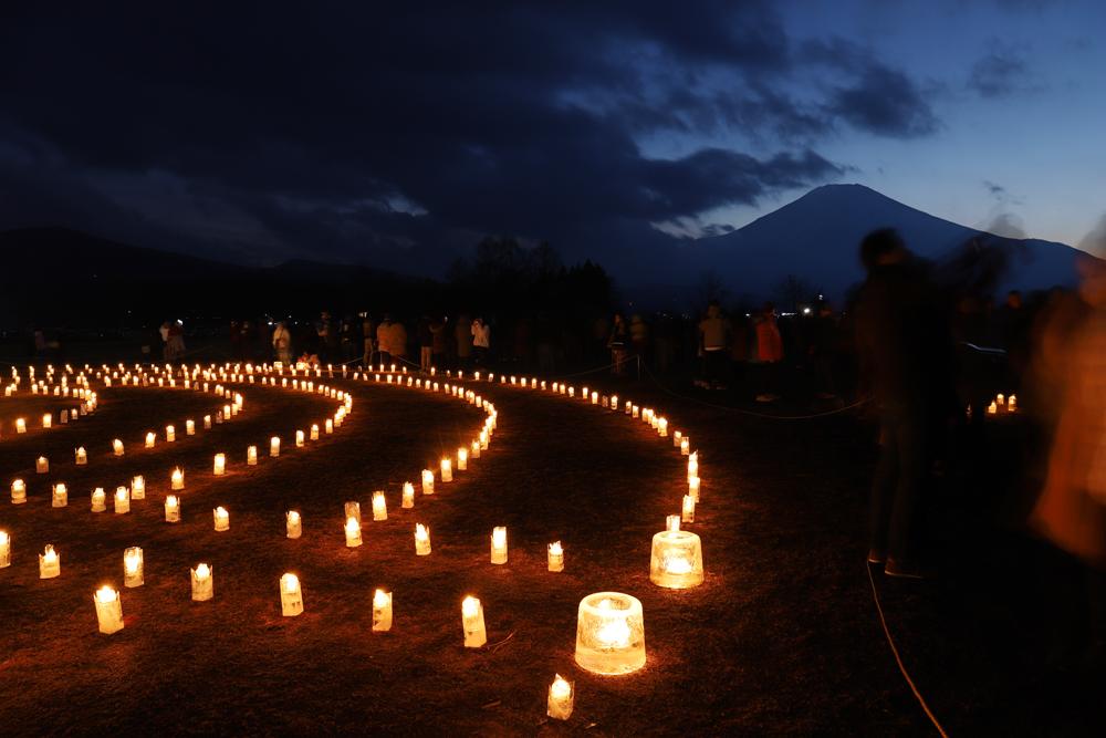 キャンドル点灯後は花火も打ち上げられ、冬の山中湖と富士山の夕景を彩る人気イベントです。