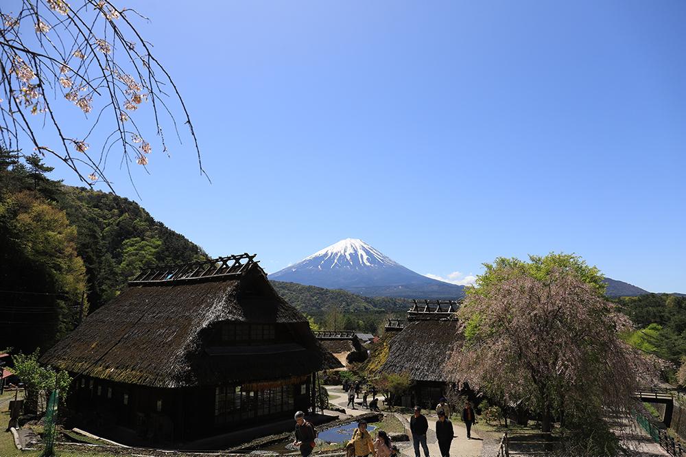 園内には茅葺屋根の民家が立ち並ぶ集落が再現されており、その向こうに見える富士山と相まって、のどかな絶景が広がるスポットです。